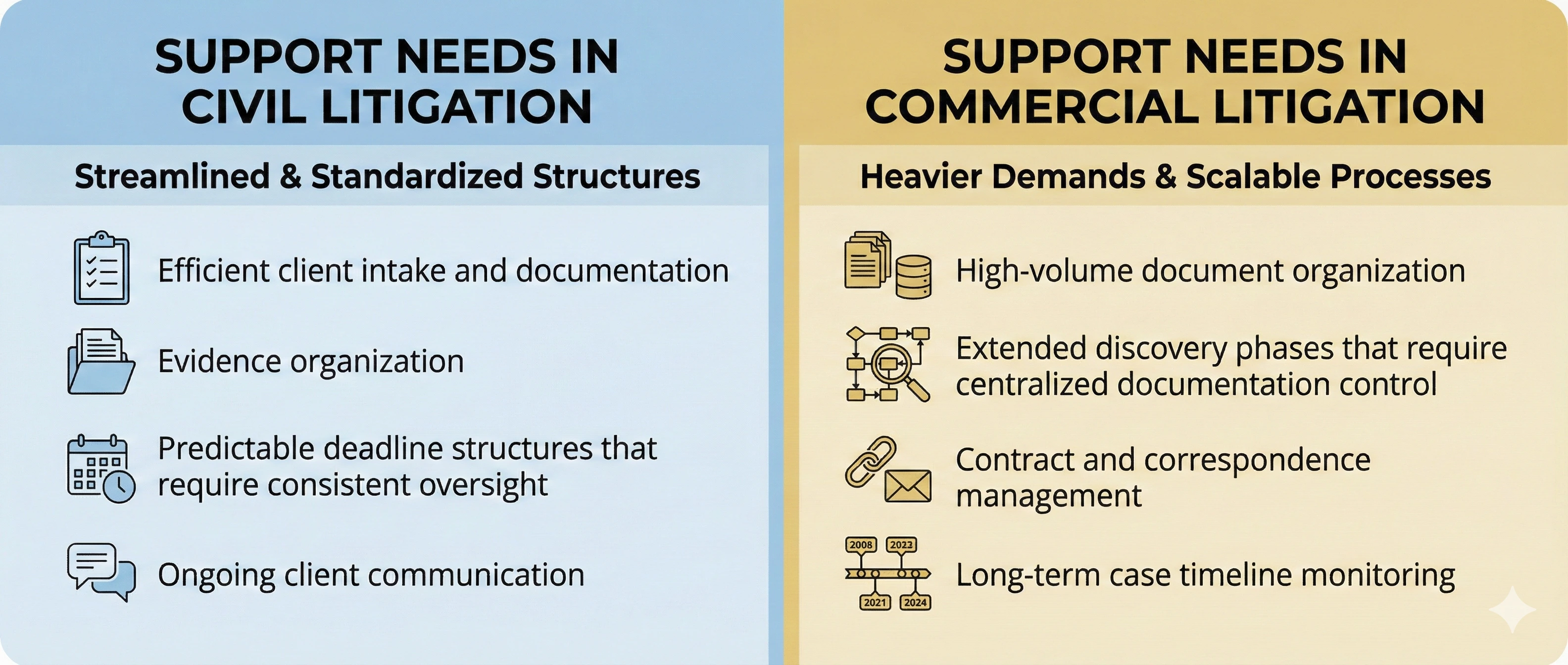 Civil cases usually require standardized intake and deadline tracking, while commercial litigation demands structured document control, extended timelines, and consistent case manager oversight.