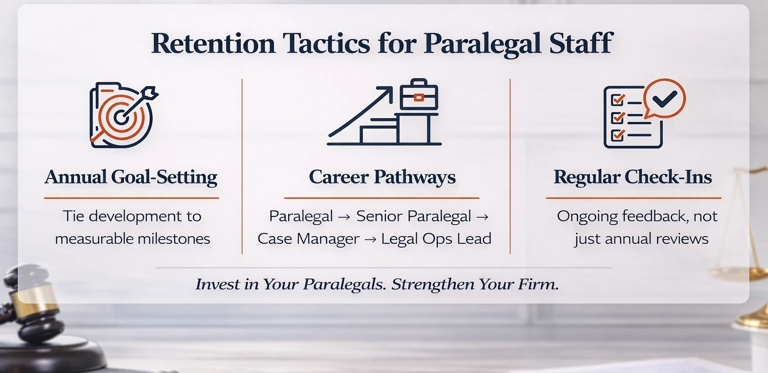 The most effective retention tool a firm has is showing paralegals exactly where they can go. Firms that implement a tier system with specific advancement criteria, including mentorship participation and skill benchmarks, give paralegals a reason to stay.