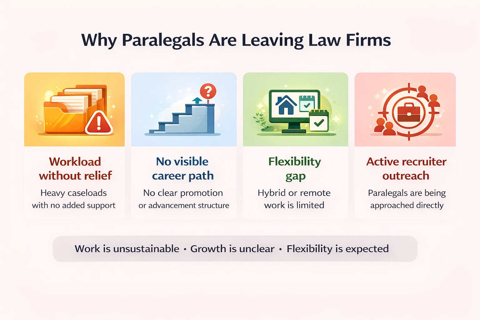 - Workload overload, unclear career paths, and limited flexibility drive most paralegal departures, not pay alone.
