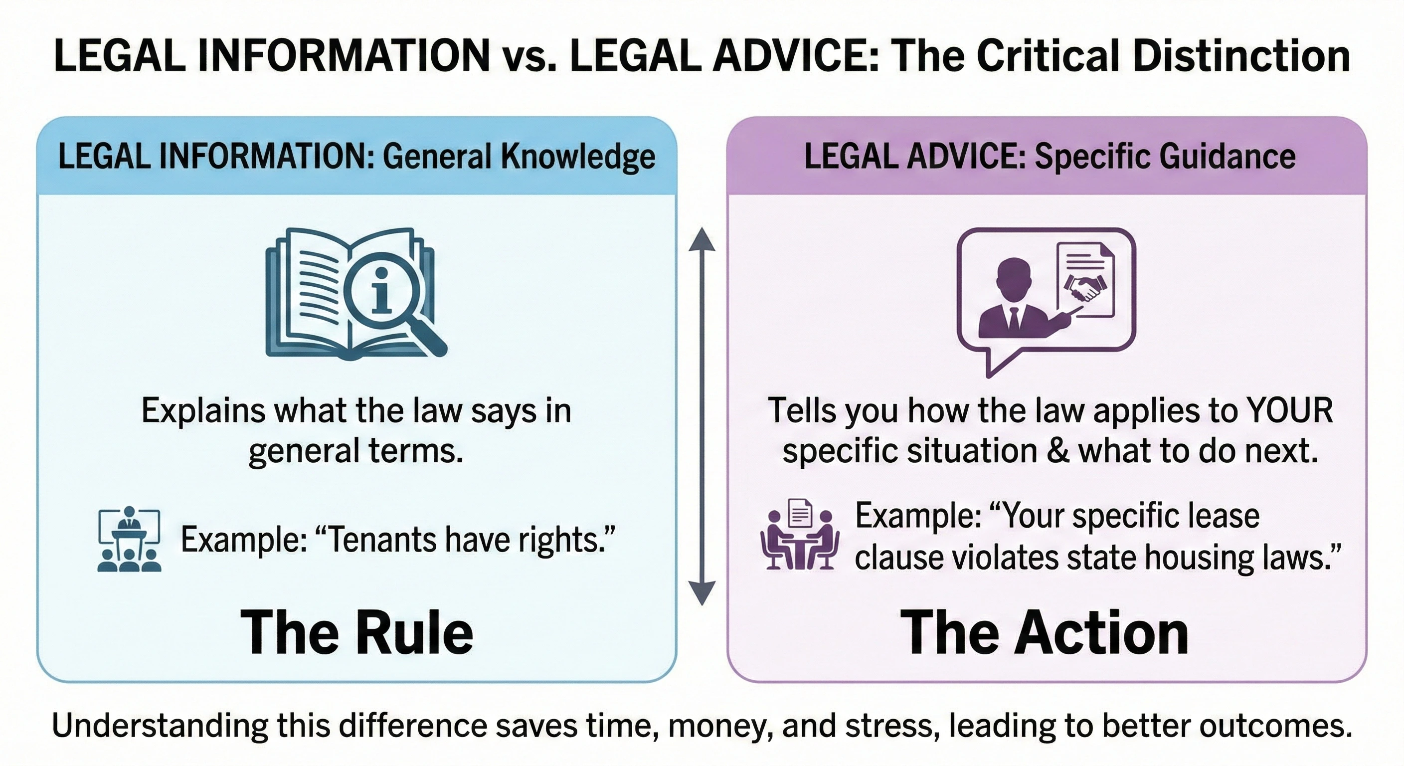 The critical distinction: Legal information explains what the law says in general terms. Legal advice tells you how the law applies to your particular situation and what you should do next.